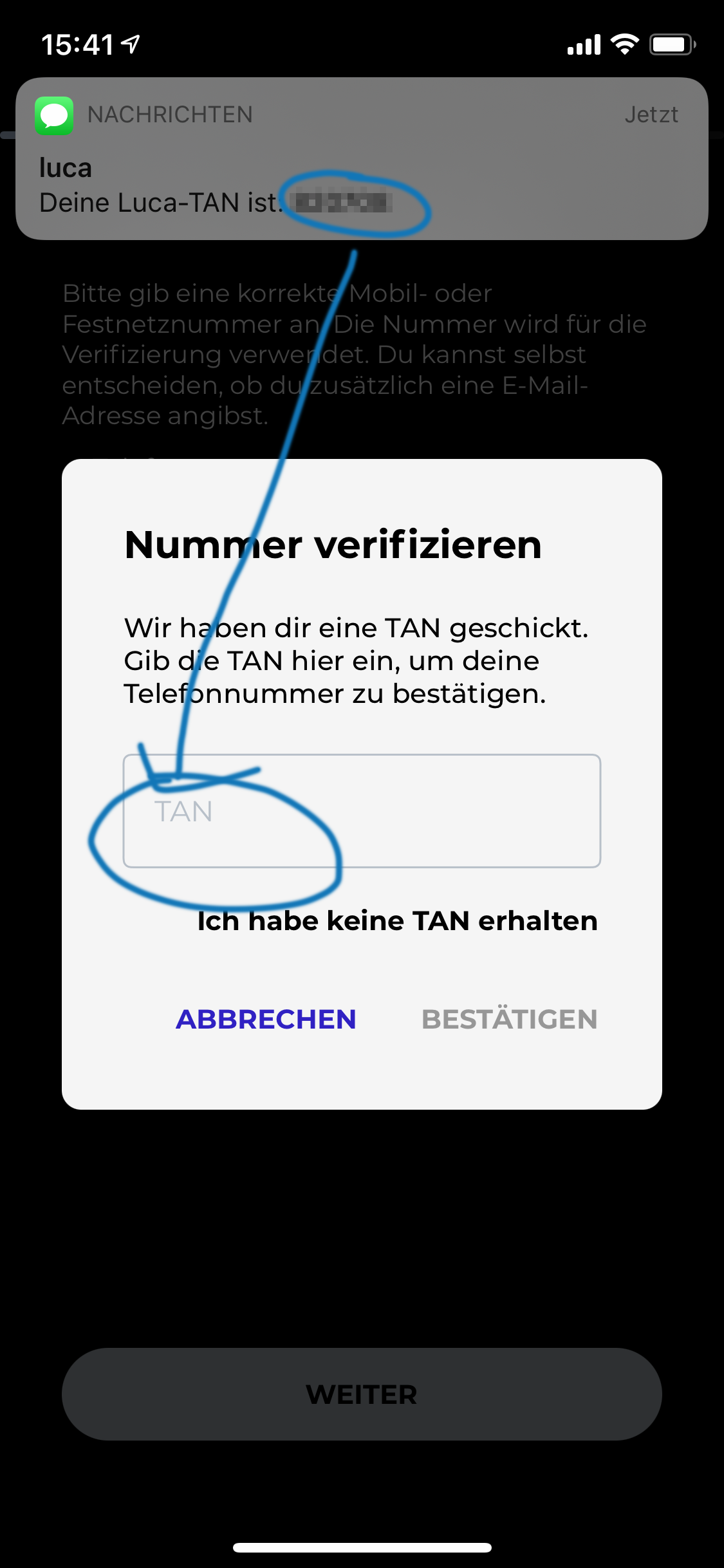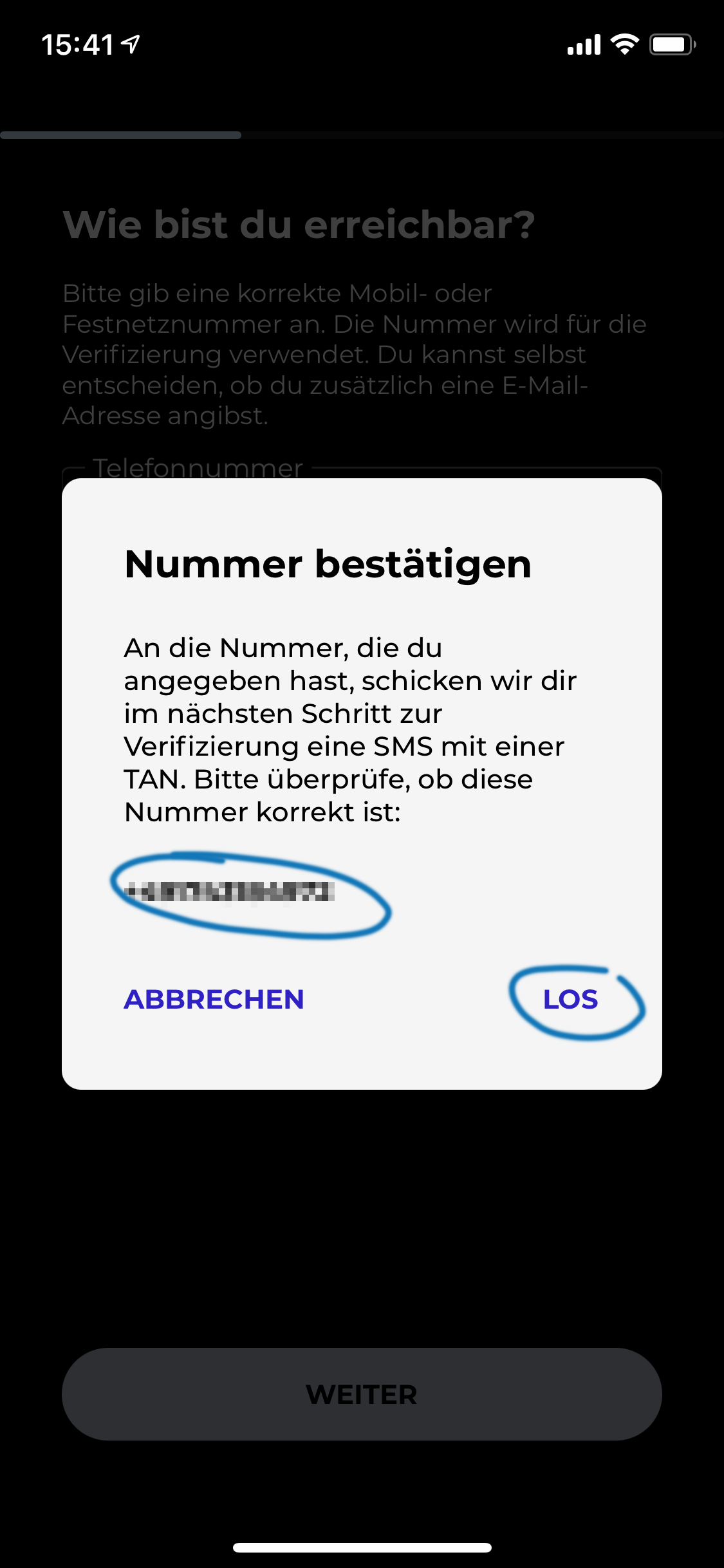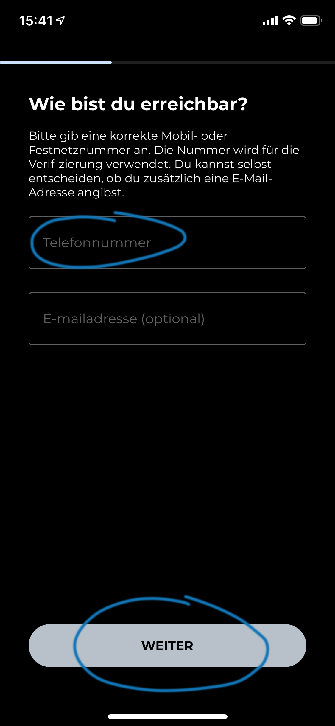 Telefonnummer eingeben. Nummer muss stimmen! Email Adresse optional eintragen. "Weiter"