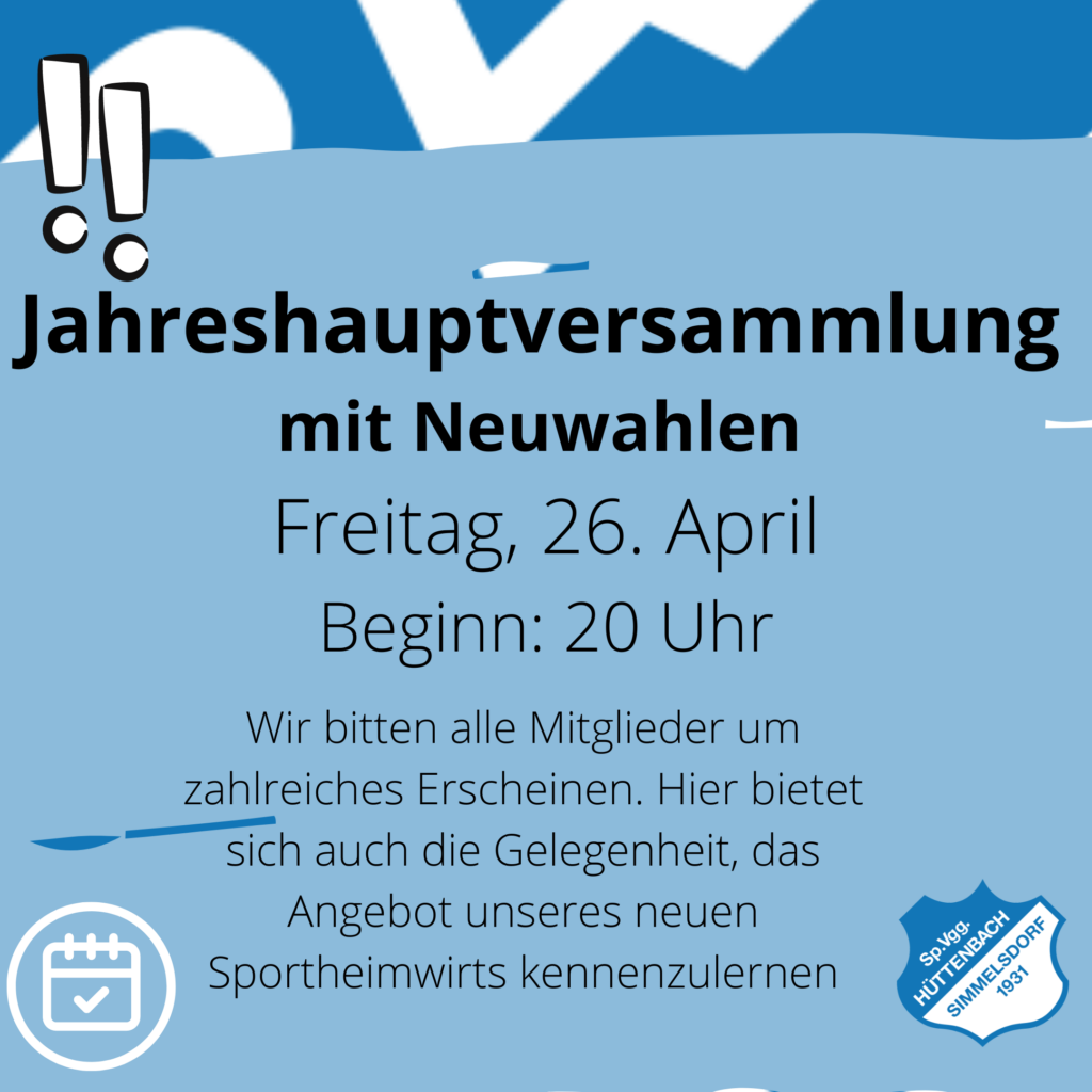 Herzliche Einladung zur Jahreshauptversammlung mit Neuwahlen der Spartenleiter und stattfindenden Ehrungen am Freitag, 26.04.2024, um 20.00 Uhr im Sportheim. Wir bitten alle Mitglieder um zahlreiches Erscheinen. Hier bietet sich auch die Gelegenheit, das Angebot unseres neuen Sportheimwirts kennenzulernen. #hüba #Versammlung #Ehrenamt #Ehre #zusammen